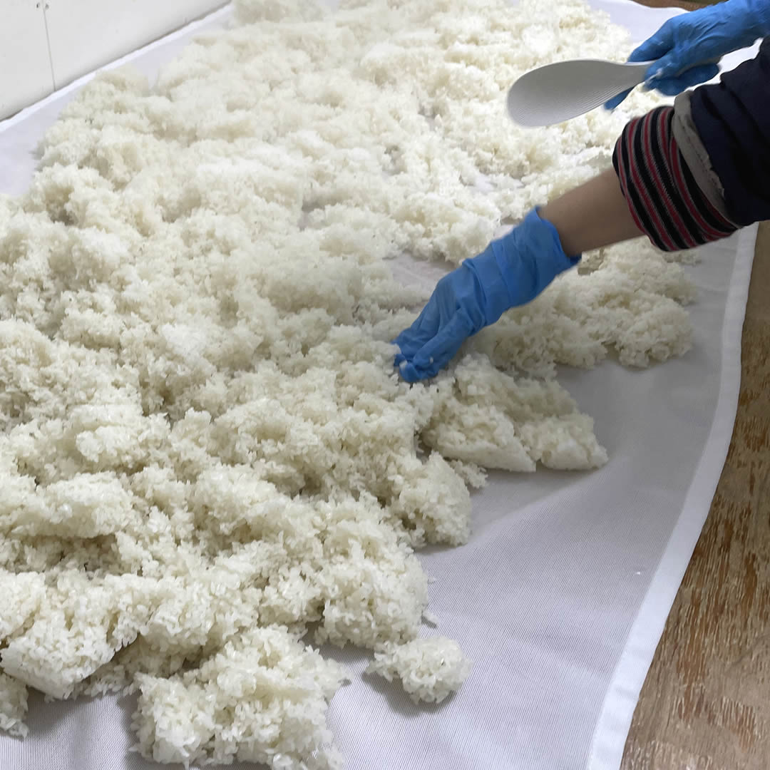 - お米を蒸して、麹菌を種付けし、米麹を仕込みます。お米が蒸し上がるいい香りに包まれます。