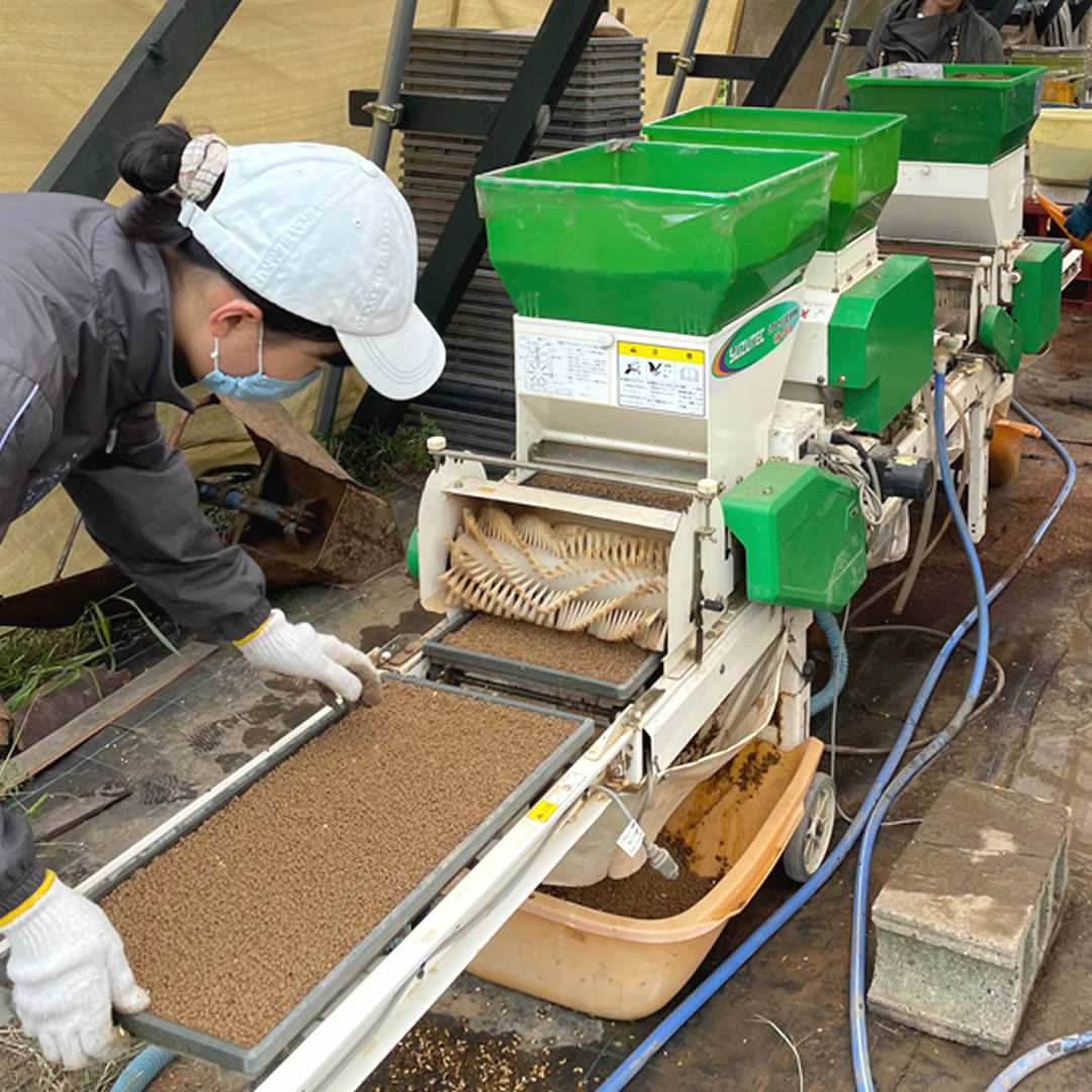 - 播種機(はしゅき)を使って、育苗箱に土を入れて、種をまきます。種は自家採種したものです。