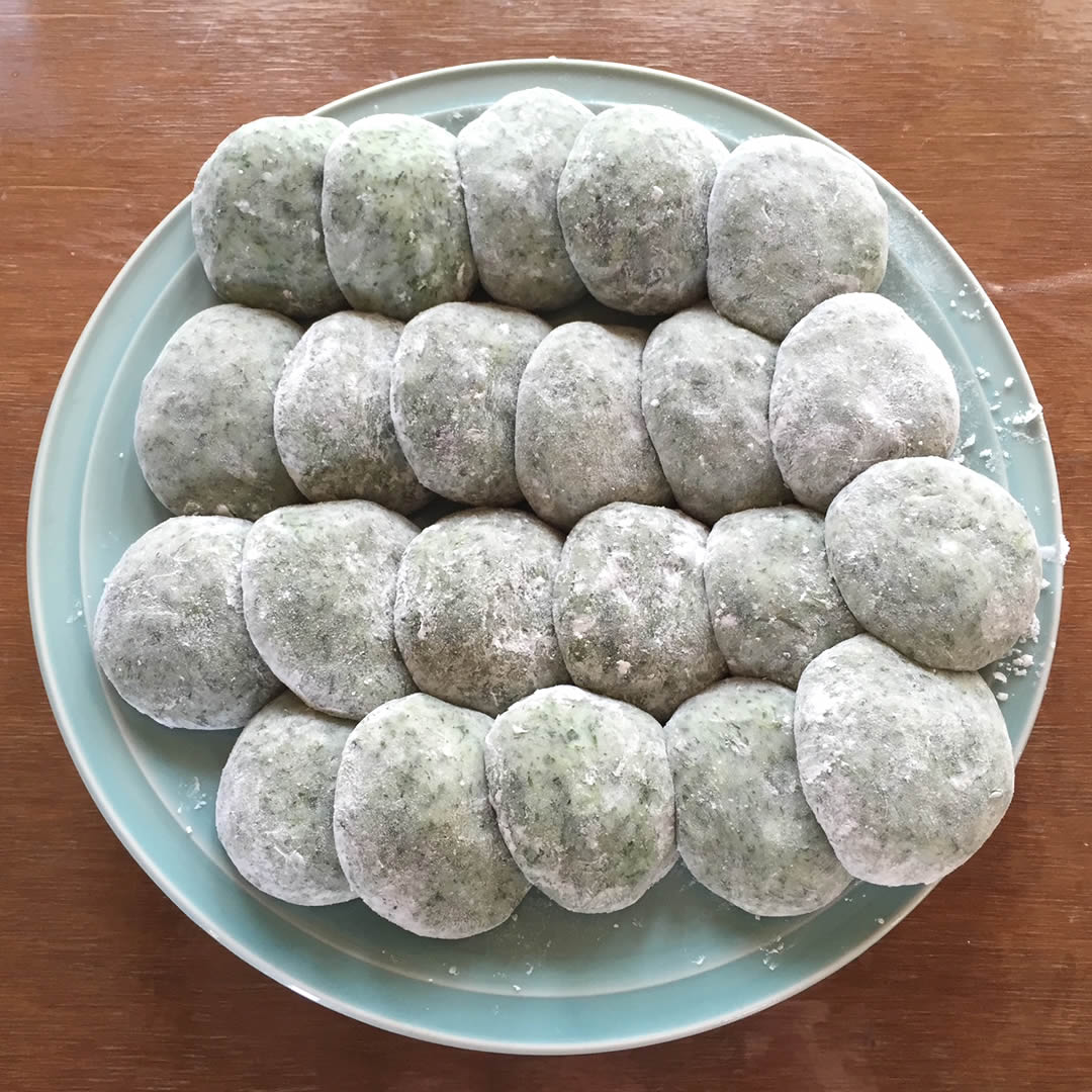 - 田んぼの側に生えているヨモギを摘んで、草餅をつくります。小豆からあんこを炊きます。