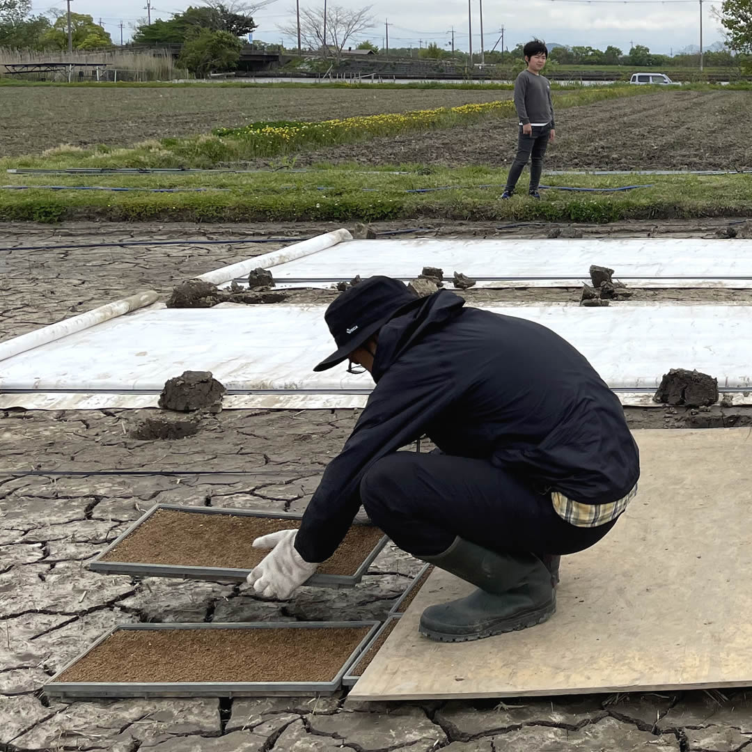 - 種をまいた育苗箱を、田んぼの苗代(なわしろ)に並べていきます。丈夫な苗を育てます。