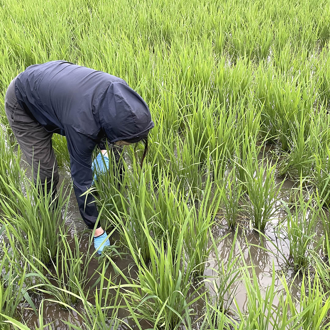 - 稲が雑草に負けないよう、草取りをします。田んぼには稲以外にもいろいろな植物が生えています。